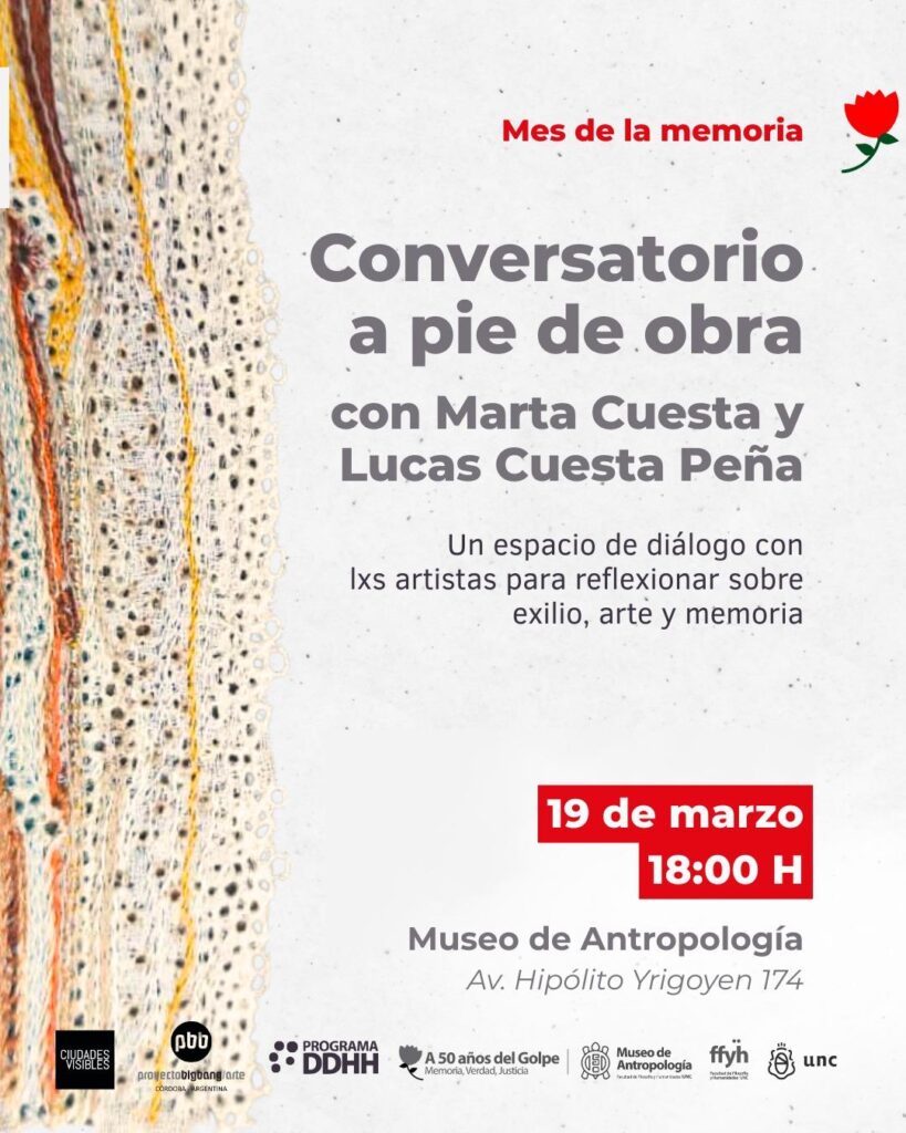 En el marco del Mes de la Memoria, a 50 años del golpe cívico-militar del 24 de marzo de 1976, Marta Cuesta y Lucas Cuesta Peña brindarán un conversatorio a pie de obra sobre la muestra “Lo que no pude ver a través de la venda que tapaba mis ojos”